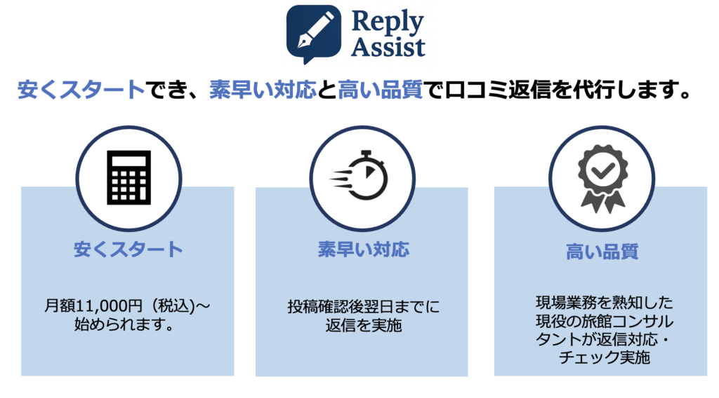 各種OTAやGoogleビジネスプロフィールに書かれたお客様の口コミへの返信業務を代行するサービスです。